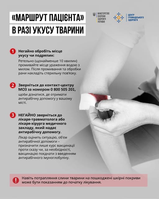 - Якомога швидше зверніться до найближчого медзакладу, що надає антирабічну допомогу. Перелік доступний за посиланням: https://tinyurl.com/w5dmnzh3