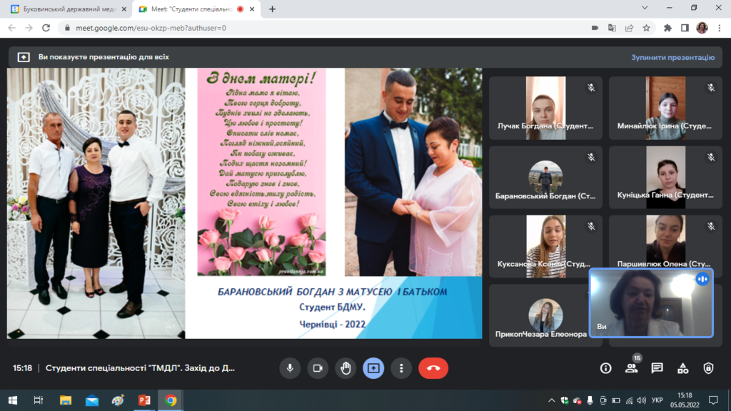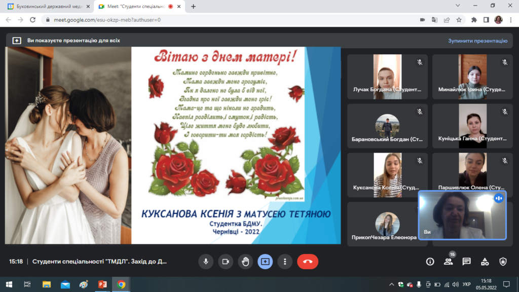 Щороку ця дата змінюється, адже заведено святкувати День матері у другу неділю травня. З цієї нагоди 05 травня 2022 року був проведений у режимі онлайн культурно-освітній захід за участі студентів 2, 3 груп 2 курсу медичного факультету №4 спеціальності «Медична психологія».